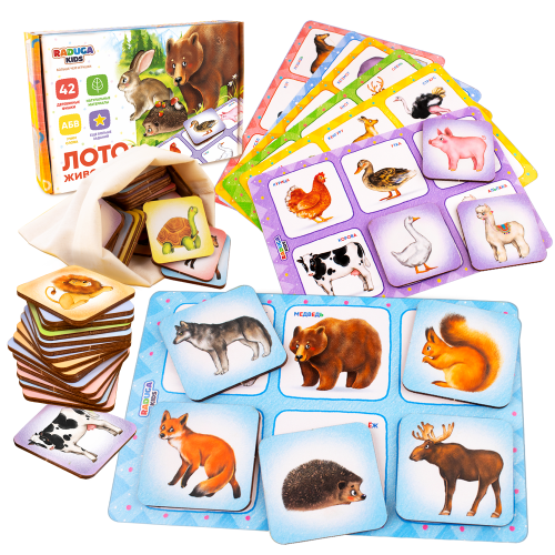 В набор входит 51 предмет: 7 двусторонних карточек с заданиями, 42 деревянных фишки с изображениями и названиями различных животных, льняной мешочек,